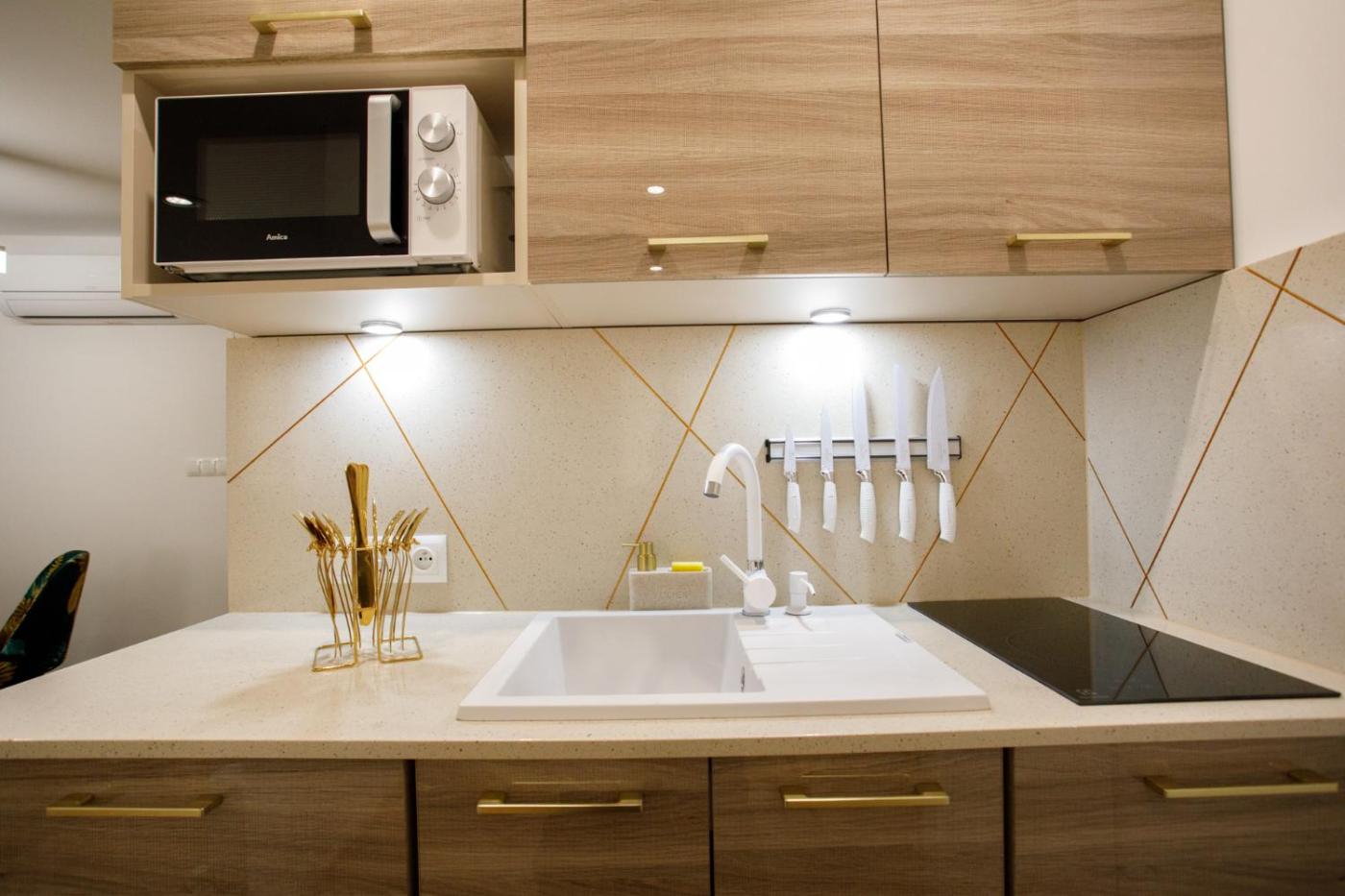 W apartamencie z 1 sypialnią zapewniono salon z telewizorem z płaskim ekranem, aneks kuchenny z pełnym wyposażeniem oraz łazienkę (1).