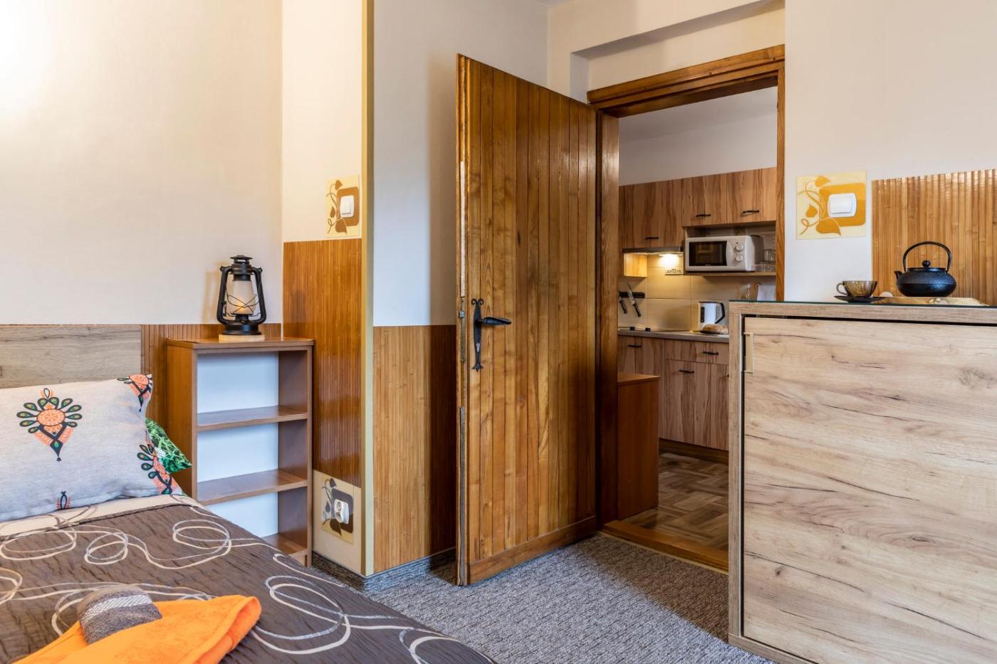 Pokój Czteroosobowy. A sunny room with a folded sofa and a balcony with a view of the garden and mountains. It features bamboo wall paneling and decorative mirror. A private bathroom comes with a shower, a hairdryer and towels. Pokój Czteroosobowy - 4 osobowy. Powierzchnia pokoju ok.: 24 mkw.